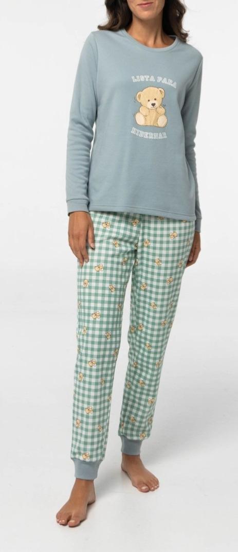 Pijama mujer de algodón interior afelpado. Camiseta  de manga larga estampado  frontal. Pantalón largo a contraste con cintura elástica y cordón para ajustar.  50% Algodón, 45% Poliester, 5% Elastano